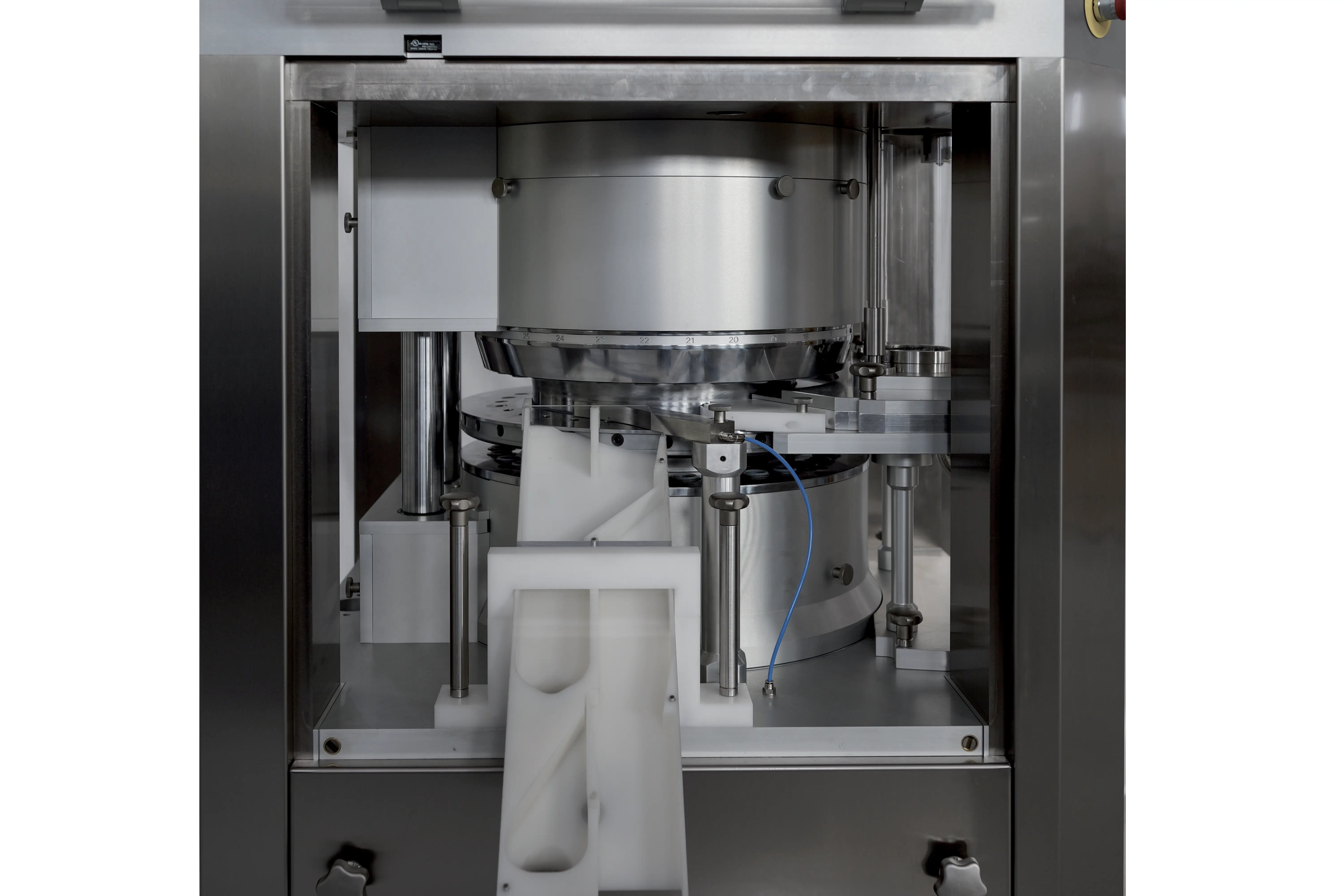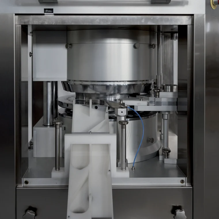 The PZ-2000 is a single-layer rotary tablet press that combines technological innovation, high performance, and a compact design, making it ideal for meeting international cGMP production standards.
